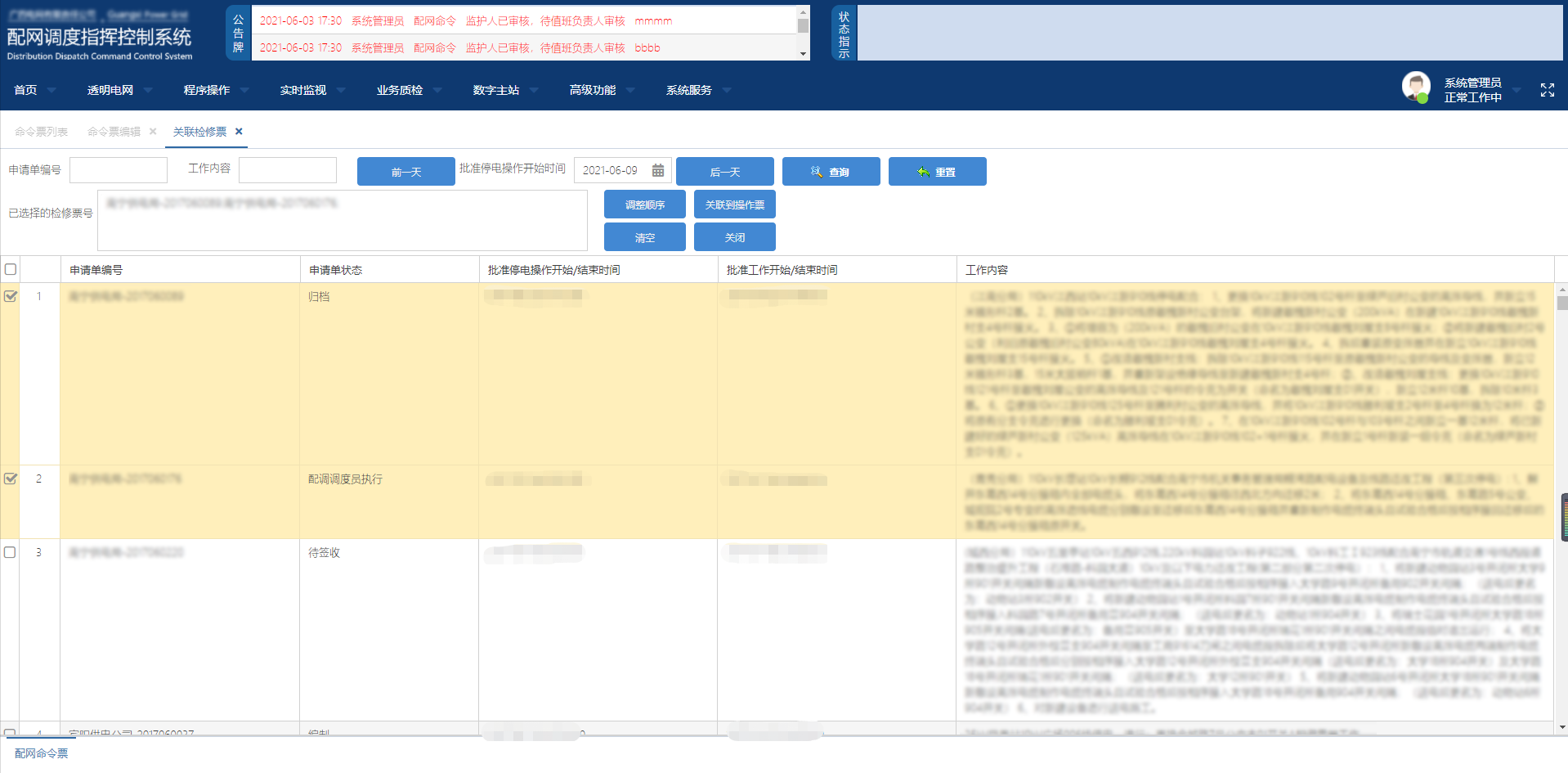 1) The system is integrated and shared with OMS maintenance sheet, personnel management and other modules, which supports the real-time acquisition of OMS maintenance sheet data in the drafting process of power outage permit/power supply permit, thus realizing drafting of one-click associated maintenance sheet and improving the convenience of drafting process.