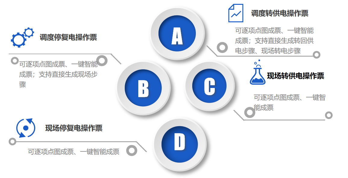 2) Based on the increasingly mature ring network diagram of DEC in the field of distribution network master station, the system shares the power grid model, graph and real-time operation information with OCS, develops the function of drawing simulation permit with high practical value, realizes the visualization of drafting link, and supports the whole process from drafting to approval and execution to prevent false locking. The whole process of drafting with scatter diagram is intelligently generated based on GIS model data, which has the characteristics such as standardization, high efficiency and burden alleviation, and has the functions of single-step issuing, intelligent drafting, historical permit generation, reverse intelligent generation, etc. The operation permit generated is subject to anti-misoperation check, power flow check, and operation rule check, and can be intelligently generated by scatter diagram operation instead of manual filling by dispatchers and field personnel.