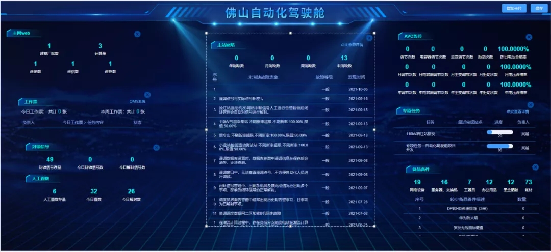 With the sustained and stable development of social economy, the scale of power grid has achieved a leap-forward growth, and will continue to develop at a high speed for a long period of time in the future, which makes the automation specialty face great pressure when carrying out statistical analysis of a large number of miscellaneous data. Meanwhile, there is a lack of effective interconnection between business systems, and automation professionals often need to turn around several systems to get the required information, which is really time-consuming and laborious. Therefore, for such big data and multi-systems, it’s a huge challenge to effectively realize "one-stop" monitoring. In order to solve the above problems, the automatic cockpit emerges at the right moment;. Since 2021, Foshan Power Supply Bureau and DFE Guangzhou R&D Center have conducted in-depth research and cooperation in the field of automatic cockpit. With the business experience accumulated by Foshan Power Supply Bureau in the field of automation and management for many years and the technical reserves of DFE R&D team in big data and Internet of Things, the automatic cockpit has been realized.