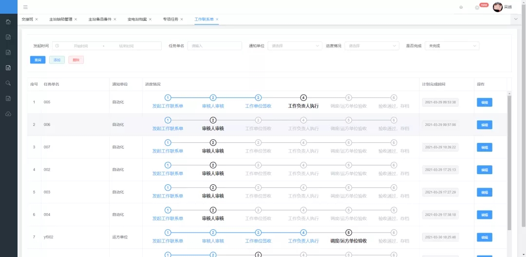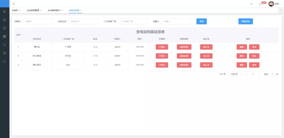 Multi-dimensional management module, which takes substation as a unit, records the IP rule list, defects and faults, memos and other information of each substation, and provides an editing interface, so that automatic shift members can operate without documents and realize electronic file management.