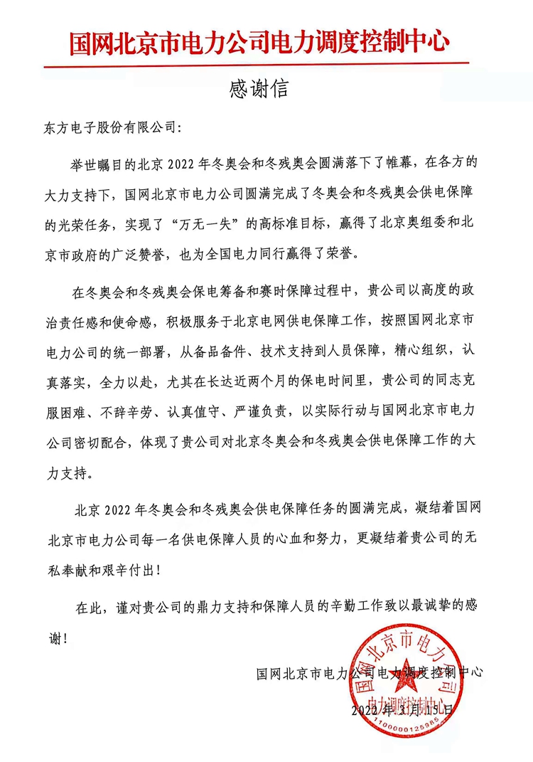 Recently, the glorious Beijing 2022 Winter Olympic Games and Paralympic Winter Games have come to a successful conclusion. During the preparation and guarantee of power supply during the Winter Olympics and the two sessions, Dongfang Electronics Corporation (hereinafter referred to as "DFE") successfully completed the task of power supply protection and won unanimous praise.