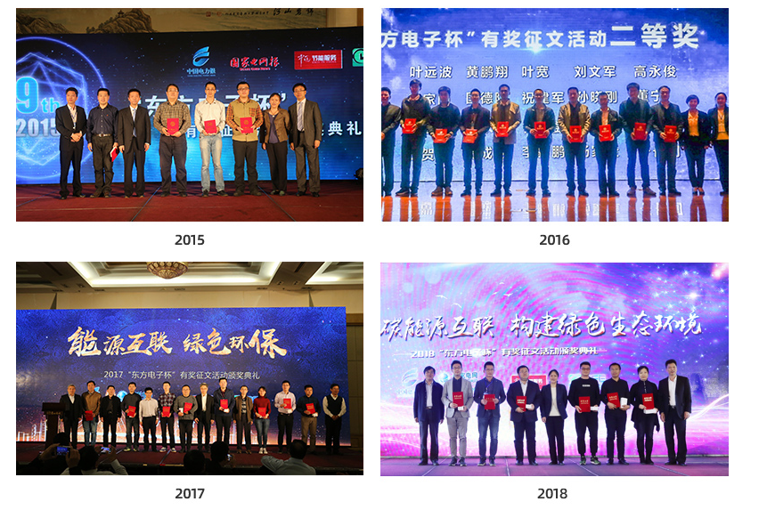 金年会电子联合中国电力传媒集团、英大传媒集团、中国电工技术学会电力系统控制与保护委员会,连续举办“金年会电子杯”有奖征文活动。十三年来,活动共收到文章1900余篇,其中获奖文章600余篇,部分优秀文章集结成册,出版了《迈向智能》和《能源互联》两本书籍。历年来,有奖征文活动的颁奖典礼与技术论坛同期举行,知名院士、电力专家、学者90余人出席活动并作专题报告,搭建了与客户沟通的平台。